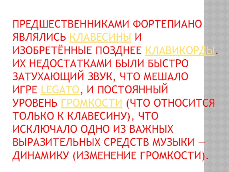Слайд 3Предшественниками фортепиано являлись клавесины и изобретённые позднее клавикорды. Их недостатками были быстро затухающий звук,