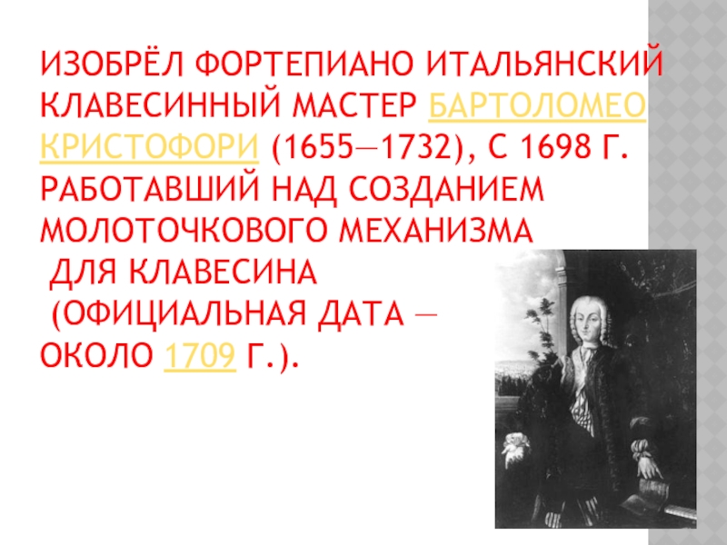 Слайд 6Изобрёл фортепиано итальянский клавесинный мастер Бартоломео Кристофори (1655—1732), с 1698 г. работавший над созданием