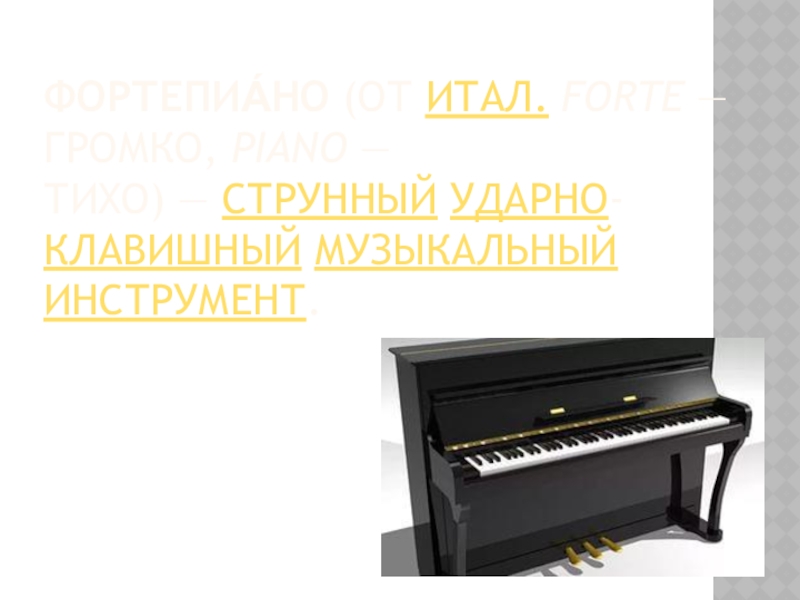 Слайд 2Фортепиа́но (от итал. forte — громко, piano — тихо) — струнный ударно-клавишный музыкальный инструмент.