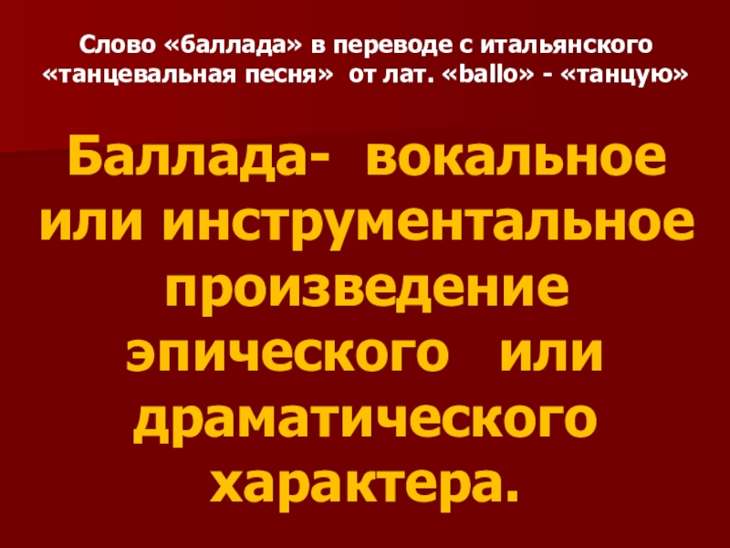 Слайд 5Слово «баллада» в переводе с итальянского «танцевальная песня» от лат. «ballo»