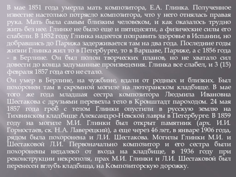 Слайд 20В мае 1851 года умерла мать композитора, Е.А. Глинка. Полученное известие