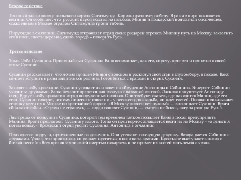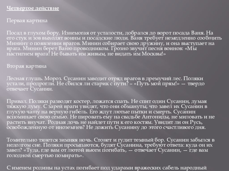 Сусанин рассказывает, что ночью пришел Минин с войском и раскинул свой стан в глухом бору, в посаде. Ваня мечтает вступить в ряды защитников родины. Готов биться с врагами и старик Сусанин.