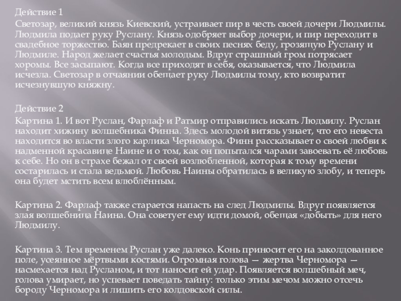 Людмилы. Людмила подает руку Руслану. Князь одобряет выбор дочери, и пир переходит в свадебное торжество. Баян предрекает в своих песнях беду, грозящую Руслану и Людмиле. Народ желает счастья молодым. Вдруг страшный гром потрясает хоромы. Все засыпают. Когда все приходят в себя, оказывается, что Людмила исчезла. Светозар в отчаянии обещает руку Людмилы тому, кто возвратит исчезнувшую княжну.