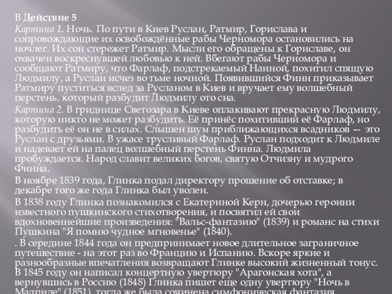 . В середине 1844 года он предпринимает новое длительное заграничное путешествие - на этот раз во Францию и Испанию. Вскоре яркие и разнообразные впечатления возвращают Глинке высокий жизненный тонус. В 1845 году он написал концертную увертюру "Арагонская хота", а вернувшись в Россию (1848) Глинка пишет еще одну увертюру "Ночь в Мадриде" (1851), тогда же была сочинена симфоническая фантазия "Камаринская" на тему русских песен.