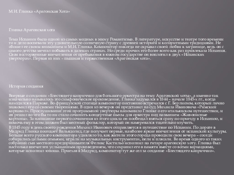 самых модных в эпоху Романтизма. В литературе, искусстве и театре того времени то и дело воспевали эту удивительную солнечную страну с древней историей и колоритными традициями. Не обошел ее своим вниманием и М.И. Глинка. Композитор никогда не скрывал своей любви к загранице, ведь он с самого детства мечтал побывать в далеких странах. Но среди прочих его более всего как раз привлекала Испания. Свои восторженные впечатления от пребывания в южном государстве он воплотил в двух «Испанских увертюрах». Первая из них – пышная и торжественная «Арагонская хота».