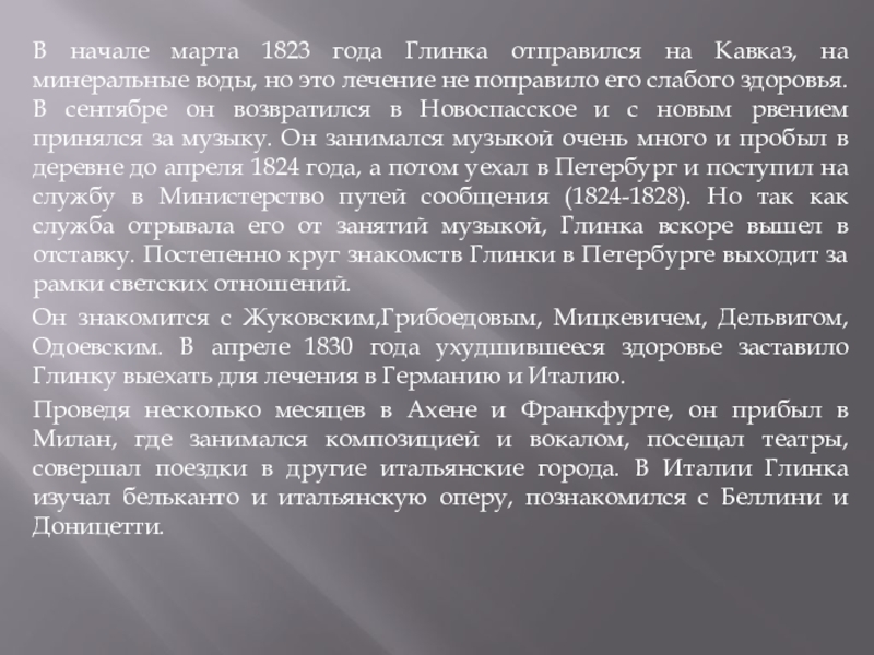 Он знакомится с Жуковским,Грибоедовым, Мицкевичем, Дельвигом, Одоевским. В апреле 1830 года ухудшившееся здоровье заставило Глинку выехать для лечения в Германию и Италию.