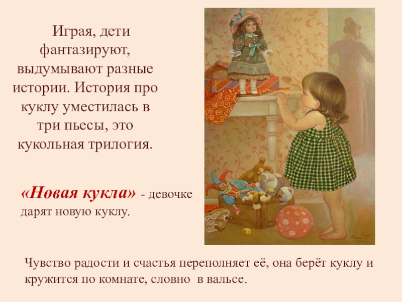 Чувство радости и счастья переполняет её, она берёт куклу и кружится по комнате, словно в вальсе.