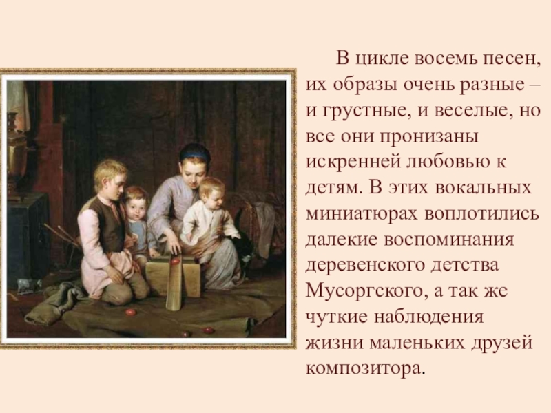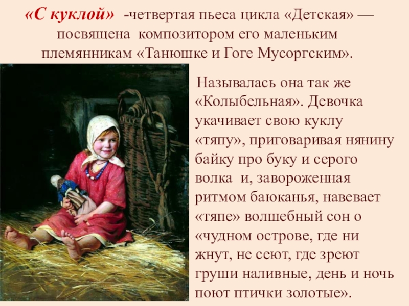 Называлась она так же «Колыбельная». Девочка укачивает свою куклу «тяпу», приговаривая нянину байку про буку и серого волка и, завороженная ритмом баюканья, навевает «тяпе» волшебный сон о «чудном острове, где ни жнут, не сеют, где зреют груши наливные, день и ночь поют птички золотые».