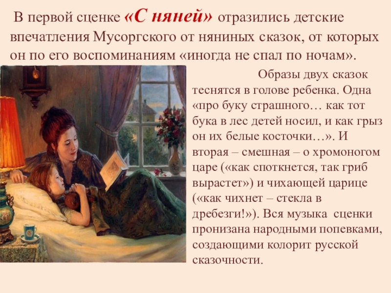 Образы двух сказок теснятся в голове ребенка. Одна «про буку страшного… как тот бука в лес детей носил, и как грыз он их белые косточки…». И вторая – смешная – о хромоногом царе («как споткнется, так гриб вырастет») и чихающей царице («как чихнет – стекла в дребезги!»). Вся музыка сценки пронизана народными попевками, создающими колорит русской сказочности.