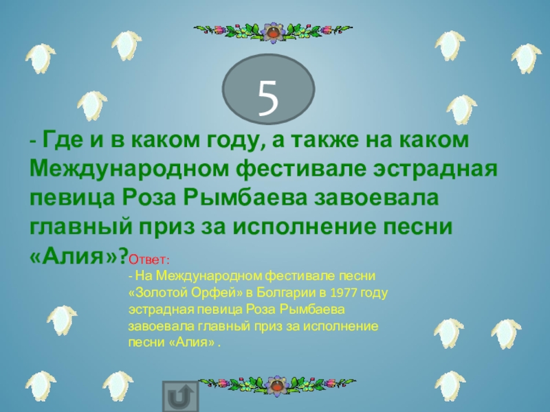 - На Международном фестивале песни «Золотой Орфей» в Болгарии в 1977 году эстрадная певица Роза Рымбаева завоевала главный приз за исполнение песни «Алия» .