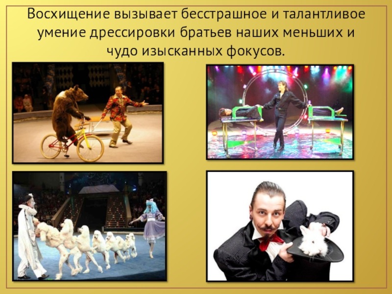 Слайд 4Восхищение вызывает бесстрашное и талантливое умение дрессировки братьев наших меньших и