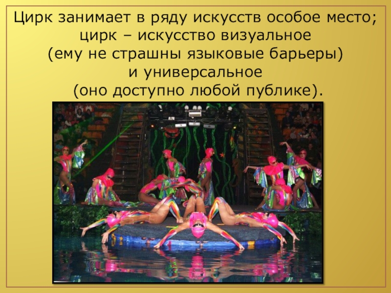 Слайд 5Цирк занимает в ряду искусств особое место; цирк – искусство визуальное