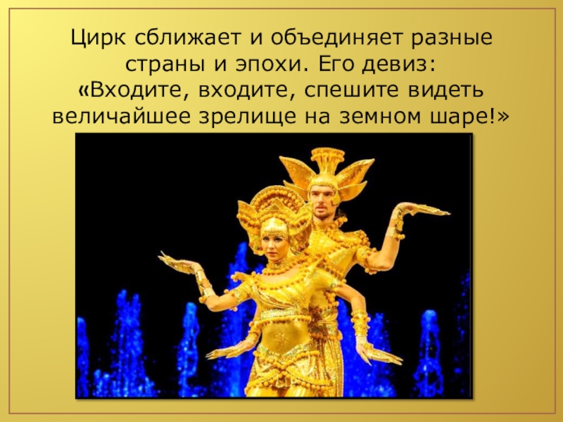 Слайд 7Цирк сближает и объединяет разные страны и эпохи. Его девиз:
