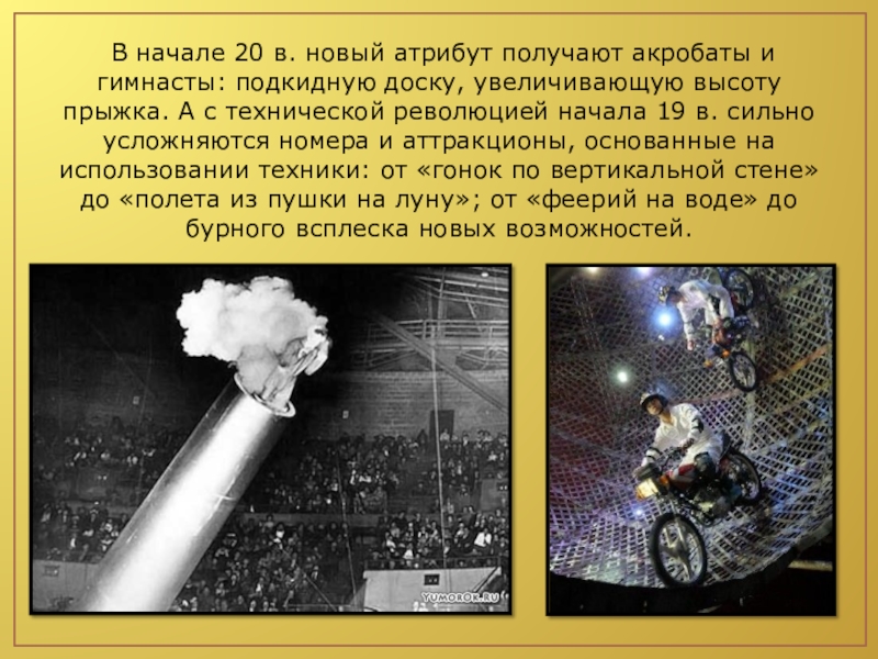подкидную доску, увеличивающую высоту прыжка. А с технической революцией начала 19 в. сильно усложняются номера и аттракционы, основанные на использовании техники: от «гонок по вертикальной стене» до «полета из пушки на луну»; от «феерий на воде» до бурного всплеска новых возможностей.