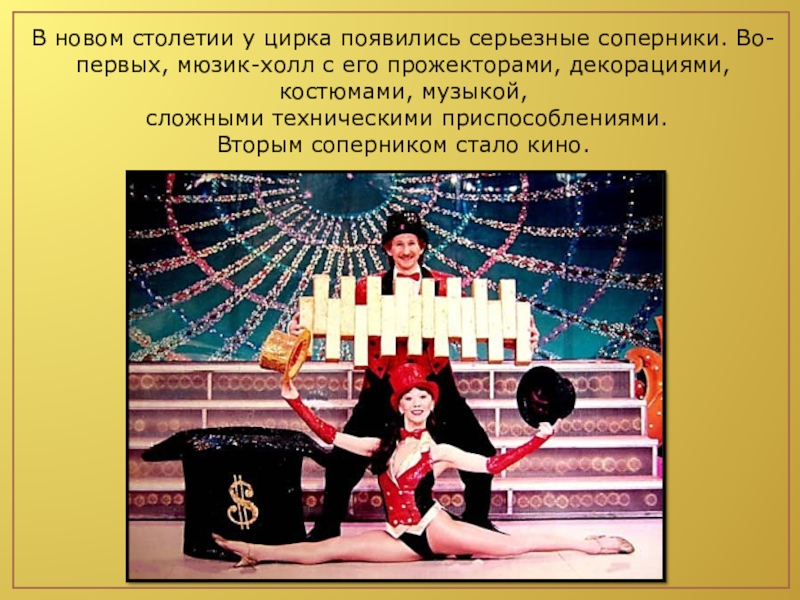Слайд 20В новом столетии у цирка появились серьезные соперники. Во-первых, мюзик-холл с
