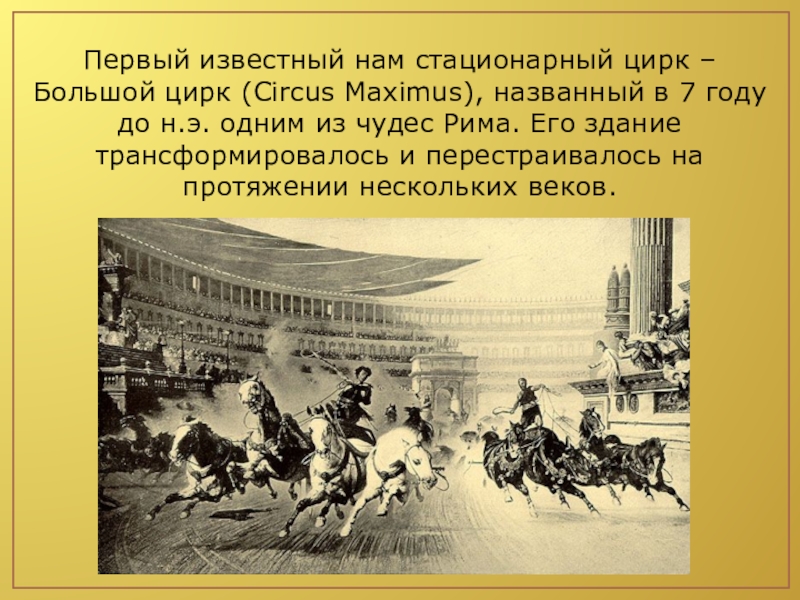 Слайд 8Первый известный нам стационарный цирк – Большой цирк (Circus Maximus), названный