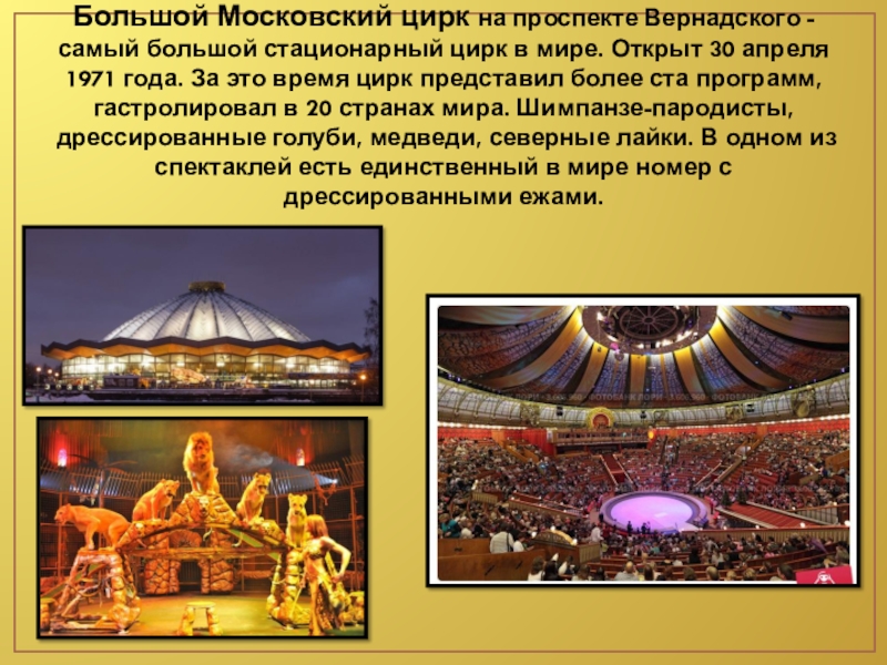 Слайд 26Большой Московский цирк на проспекте Вернадского - самый большой стационарный цирк