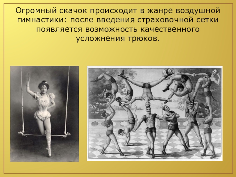 Слайд 18Огромный скачок происходит в жанре воздушной гимнастики: после введения страховочной сетки