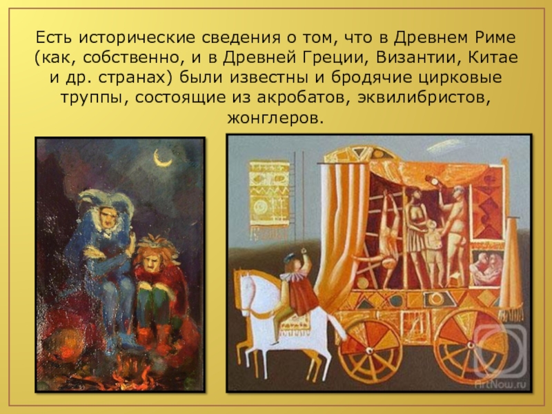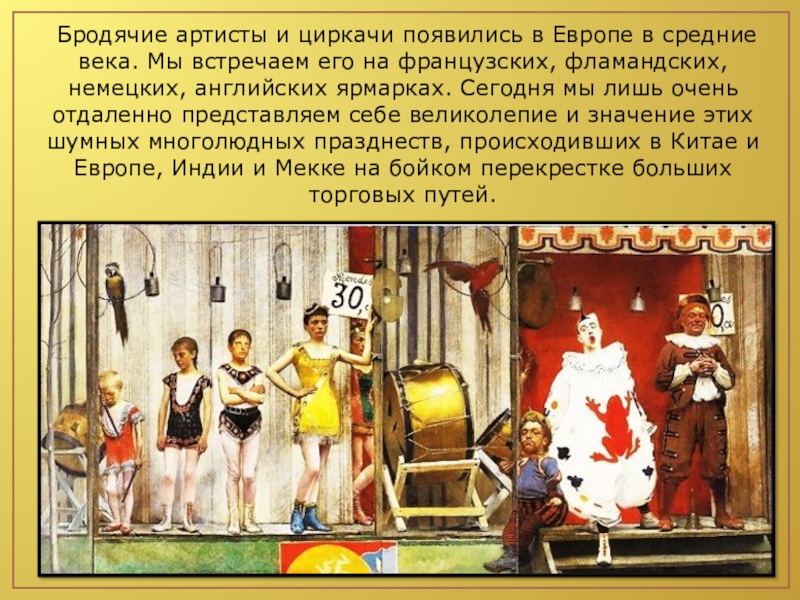 Слайд 12 Бродячие артисты и циркачи появились в Европе в средние века. Мы
