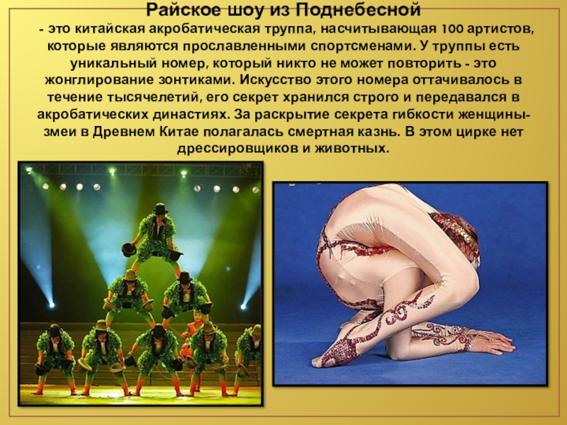 артистов, которые являются прославленными спортсменами. У труппы есть уникальный номер, который никто не может повторить - это жонглирование зонтиками. Искусство этого номера оттачивалось в течение тысячелетий, его секрет хранился строго и передавался в акробатических династиях. За раскрытие секрета гибкости женщины-змеи в Древнем Китае полагалась смертная казнь. В этом цирке нет дрессировщиков и животных.