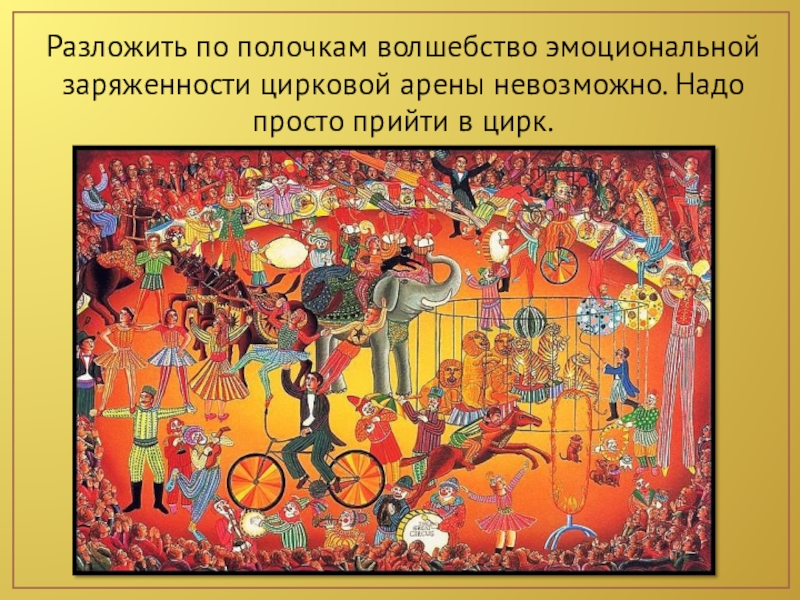 Слайд 22Разложить по полочкам волшебство эмоциональной заряженности цирковой арены невозможно. Надо просто