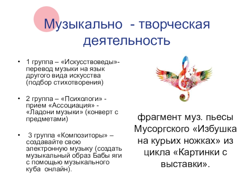 фрагмент муз. пьесы Мусоргского «Избушка на курьих ножках» из цикла «Картинки с выставки».
