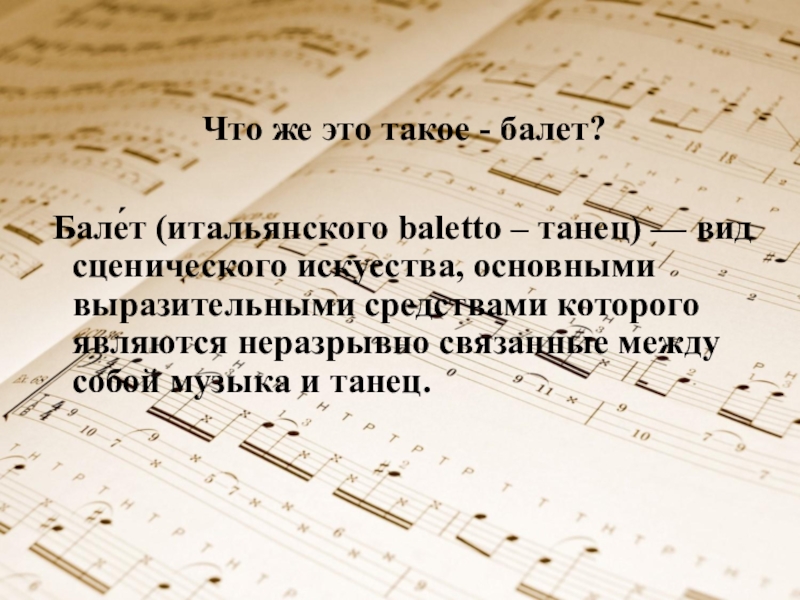 Что же это такое - балет? Бале́т (итальянского baletto – танец) — вид сценического искусства, основными выразительными