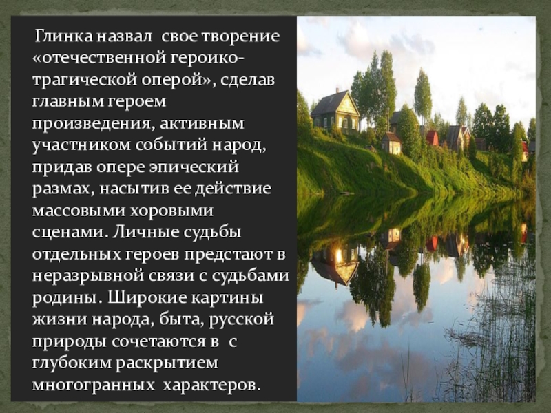 Слайд 14 Глинка назвал свое творение «отечественной героико-трагической оперой», сделав главным
