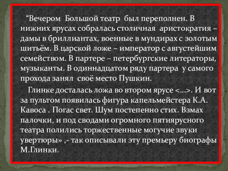 Глинке досталась ложа во втором ярусе <...>. И вот за пультом появилась фигура капельмейстера К.А. Кавоса . Погас свет. Шум постепенно стих. Взмах палочки, и под сводами огромного пятиярусного театра полились торжественные могучие звуки увертюры» ,- так описывали эту премьеру биографы М.Глинки.