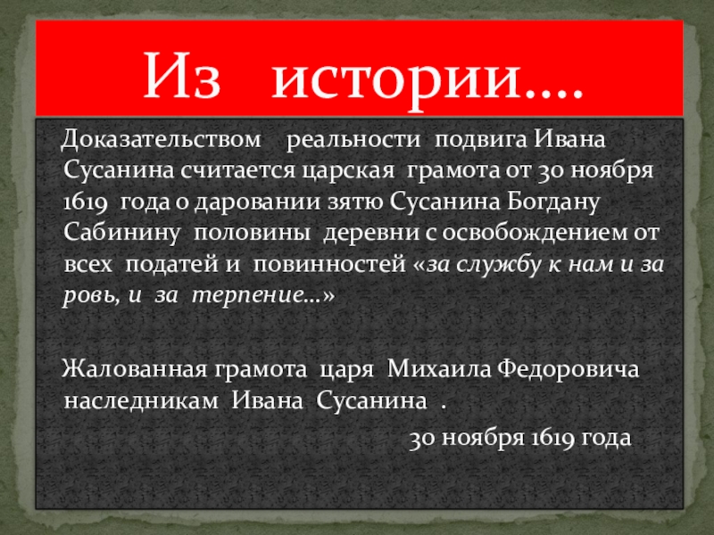 от 30 ноября 1619 года о даровании зятю Сусанина Богдану Сабинину половины деревни с освобождением от всех податей и повинностей «за службу к нам и за ровь, и за терпение…»