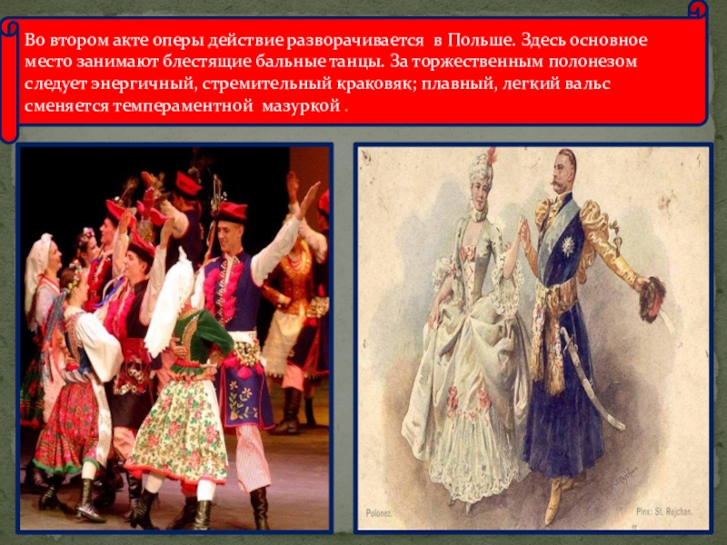занимают блестящие бальные танцы. За торжественным полонезом следует энергичный, стремительный краковяк; плавный, легкий вальс сменяется темпераментной мазуркой .