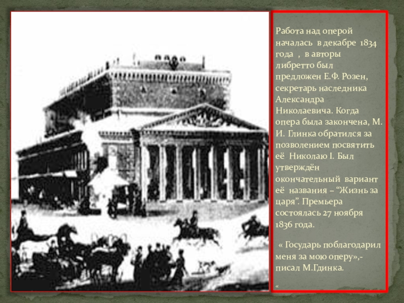 либретто был предложен Е.Ф. Розен, секретарь наследника Александра Николаевича. Когда опера была закончена, М.И. Глинка обратился за позволением посвятить её Николаю I. Был утверждён окончательный вариант её названия – “Жизнь за царя”. Премьера состоялась 27 ноября 1836 года.