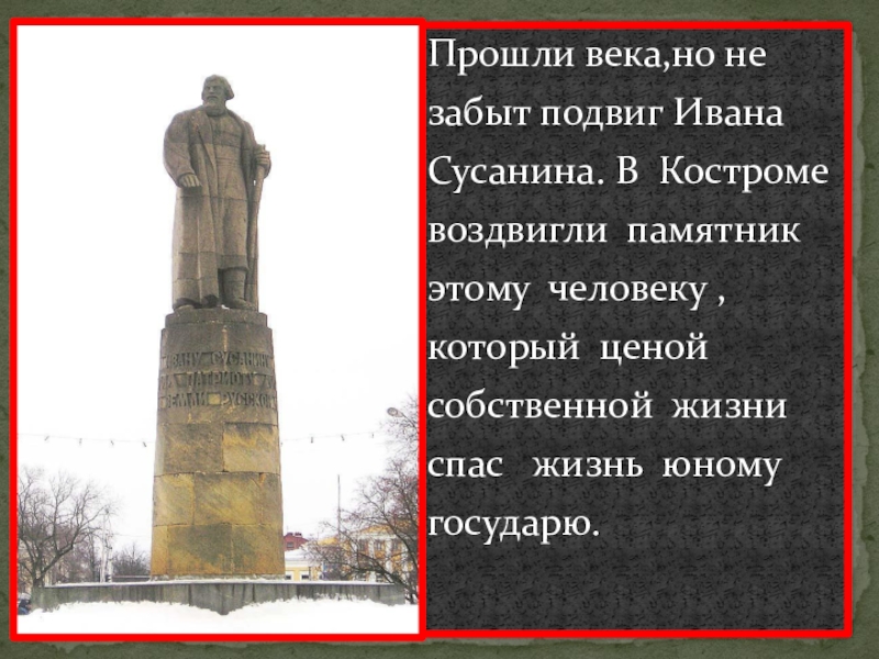 Слайд 21Прошли века,но не забыт подвиг Ивана Сусанина. В Костроме воздвигли