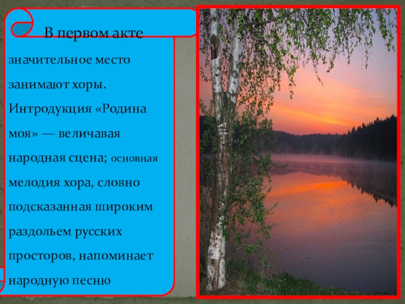 хоры. Интродукция «Родина моя» — величавая народная сцена; основная мелодия хора, словно подсказанная широким раздольем русских просторов, напоминает народную песню