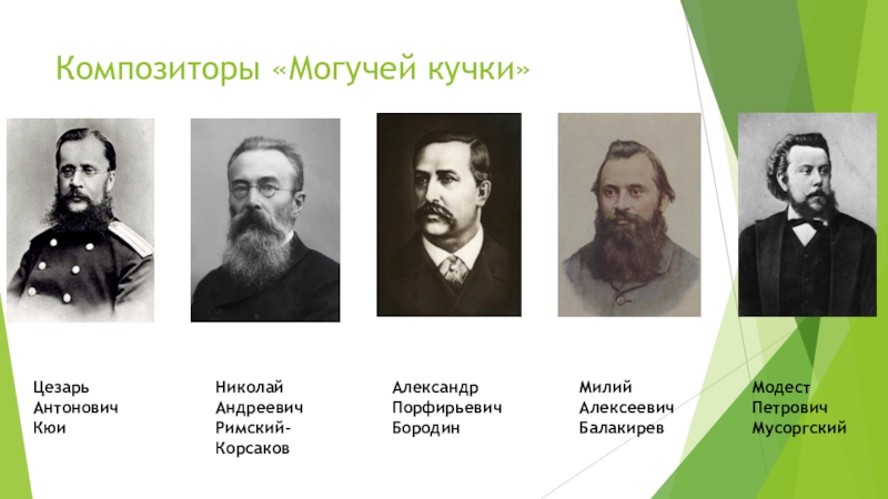 Композиторы «Могучей кучки»НиколайАндреевичРимский-КорсаковАлександр Порфирьевич БородинМилий Алексеевич БалакиревМодест Петрович МусоргскийЦезарь АнтоновичКюи