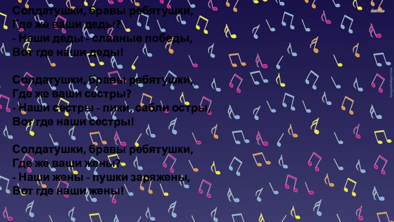 Солдатушки, бравы ребятушки,Где же ваши деды?- Наши деды - славные победы,Вот где наши деды!Солдатушки, бравы ребятушки,Где же