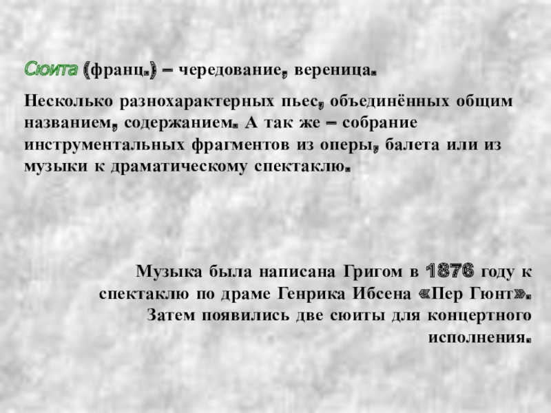 Музыка была написана Григом в 1876 году к спектаклю по драме Генрика Ибсена «Пер Гюнт». Затем появились две сюиты для концертного исполнения.
