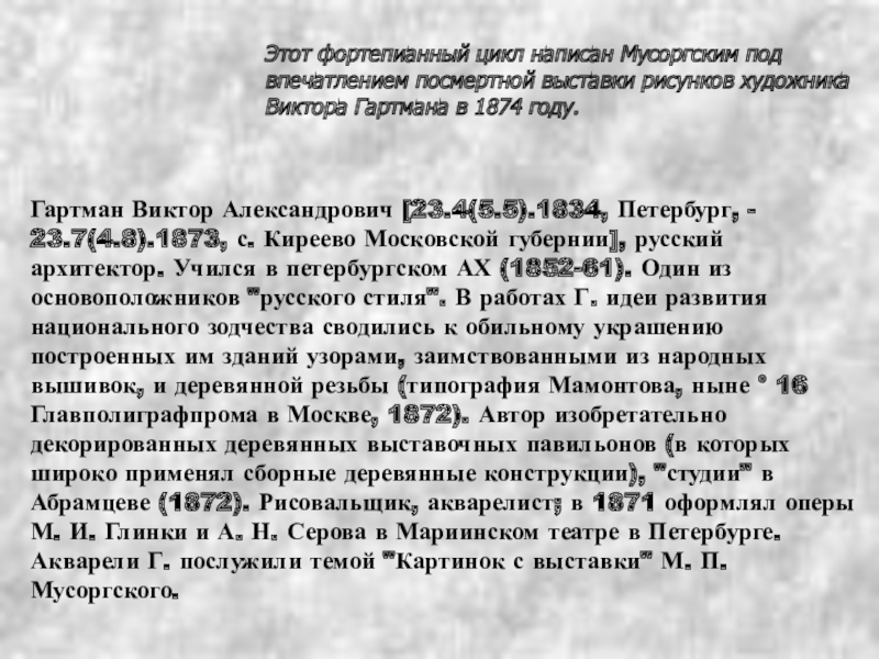 Гартман Виктор Александрович [23.4(5.5).1834, Петербург, - 23.7(4.8).1873, с. Киреево Московской губернии], русский архитектор. Учился в петербургском АХ (1852-61). Один из основоположников "русского стиля". В работах Г. идеи развития национального зодчества сводились к обильному украшению построенных им зданий узорами, заимствованными из народных вышивок, и деревянной резьбы (типография Мамонтова, ныне ° 16 Главполиграфпрома в Москве, 1872). Автор изобретательно декорированных деревянных выставочных павильонов (в которых широко применял сборные деревянные конструкции), "студии" в Абрамцеве (1872). Рисовальщик, акварелист; в 1871 оформлял оперы М. И. Глинки и А. Н. Серова в Мариинском театре в Петербурге. Акварели Г. послужили темой "Картинок с выставки" М. П. Мусоргского.