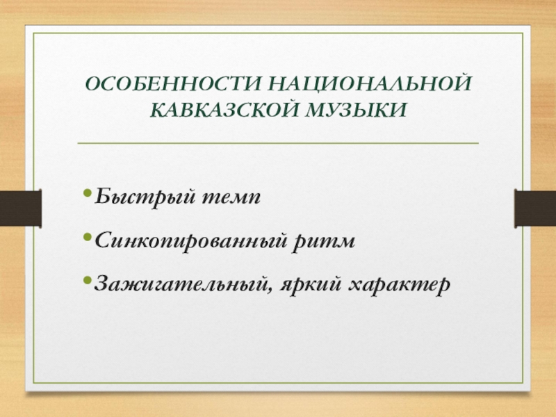 ОСОБЕННОСТИ НАЦИОНАЛЬНОЙ КАВКАЗСКОЙ МУЗЫКИБыстрый темпСинкопированный ритмЗажигательный, яркий характер