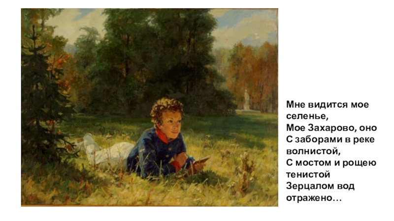 Мне видится мое селенье,Мое Захарово, оноС заборами в реке волнистой,С мостом и рощею тенистойЗерцалом вод отражено…