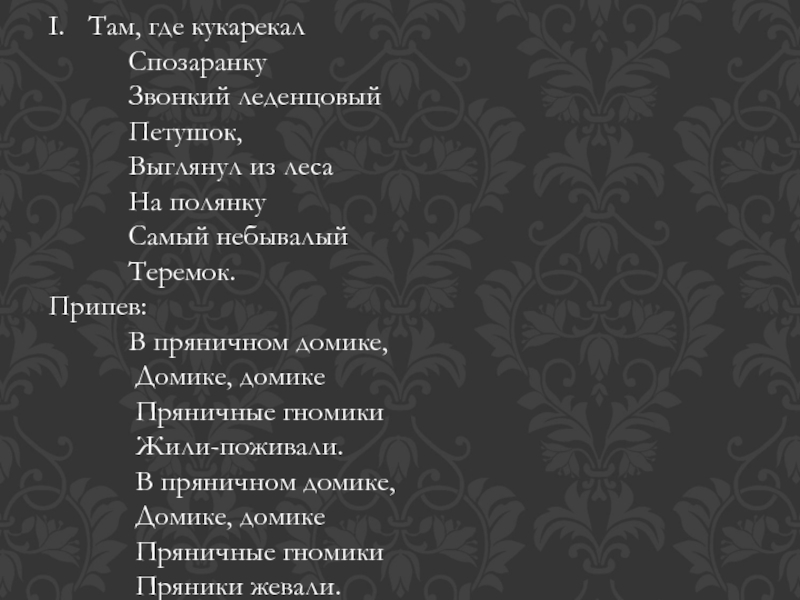 I.	Там, где кукарекалСпозаранкуЗвонкий леденцовыйПетушок,Выглянул из лесаНа полянкуСамый небывалыйТеремок.Припев:В пряничном домике, Домике, домике Пряничные гномики Жили-поживали. В пряничном
