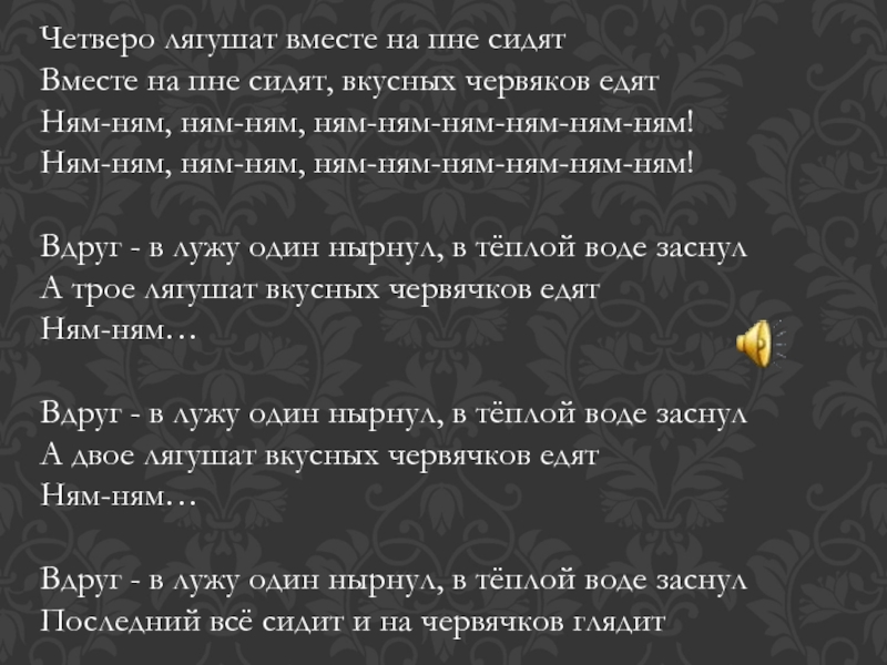 Четверо лягушат вместе на пне сидятВместе на пне сидят, вкусных червяков едятНям-ням, ням-ням, ням-ням-ням-ням-ням-ням!Ням-ням, ням-ням, ням-ням-ням-ням-ням-ням!Вдруг -