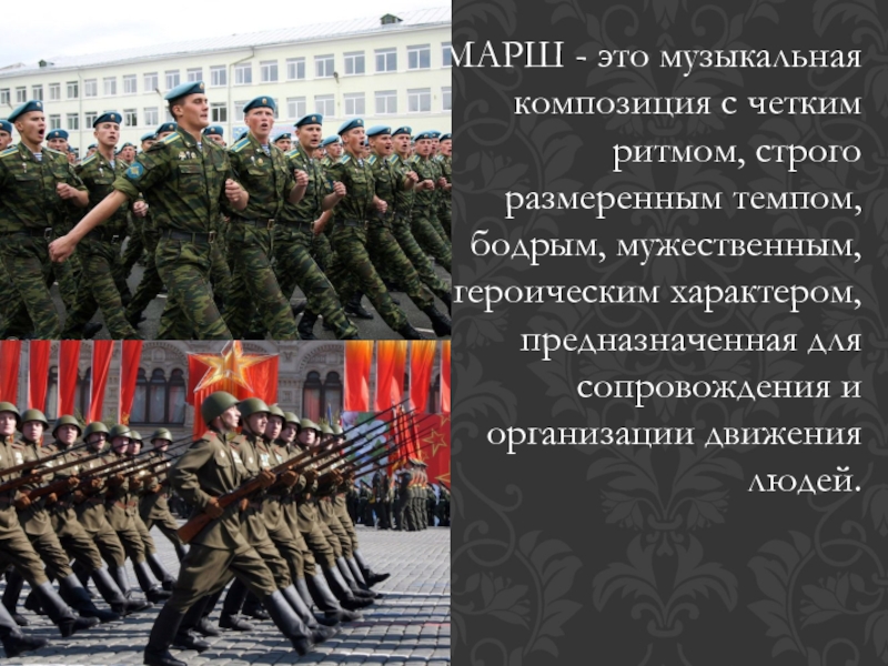 МАРШ - это музыкальная композиция с четким ритмом, строго размеренным темпом, бодрым, мужественным, героическим характером, предназначенная для сопровождения и организации движения людей.