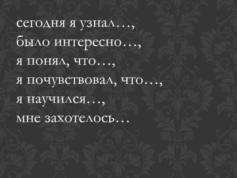 сегодня я узнал…, было интересно…, я понял, что…, я почувствовал, что…, я научился…, мне захотелось…