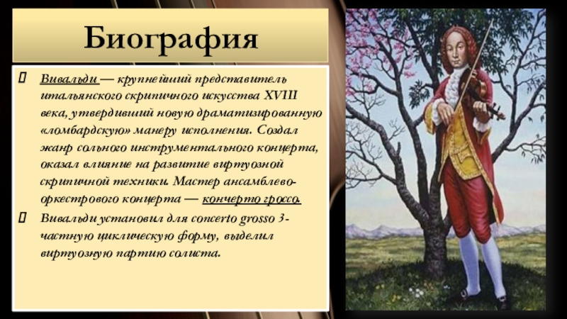 Вивальди — крупнейший представитель итальянского скрипичного искусства XVIII века, утвердивший новую