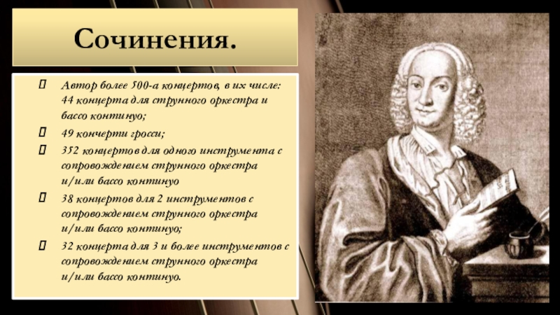 352 концертов для одного инструмента с сопровождением струнного оркестра и/или бассо континуо