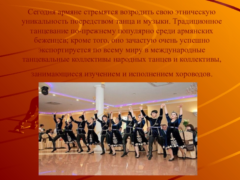 Слайд 14Сегодня армяне стремятся возродить свою этническую уникальность посредством танца и музыки.