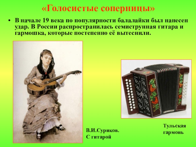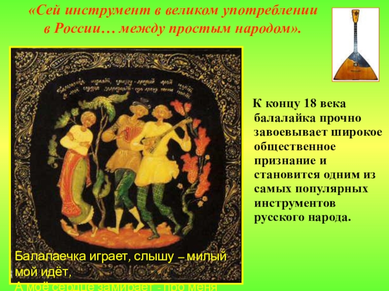 К концу 18 века балалайка прочно завоевывает широкое общественное признание и становится одним из самых популярных инструментов русского народа.