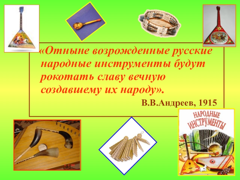 В особенности заинтересовали Андреева балалайки Вятской губернии. Там, в глуши Вятских лесов, сохранились еще традиции, восходящие чуть ли не к концу 18 века. Вятские балалайки своим круглым, вернее, полушаровидным кузовом очень напоминали Андрееву мандолины. Однако играли на них обычным народным балалаечным приемом - бряцанием.