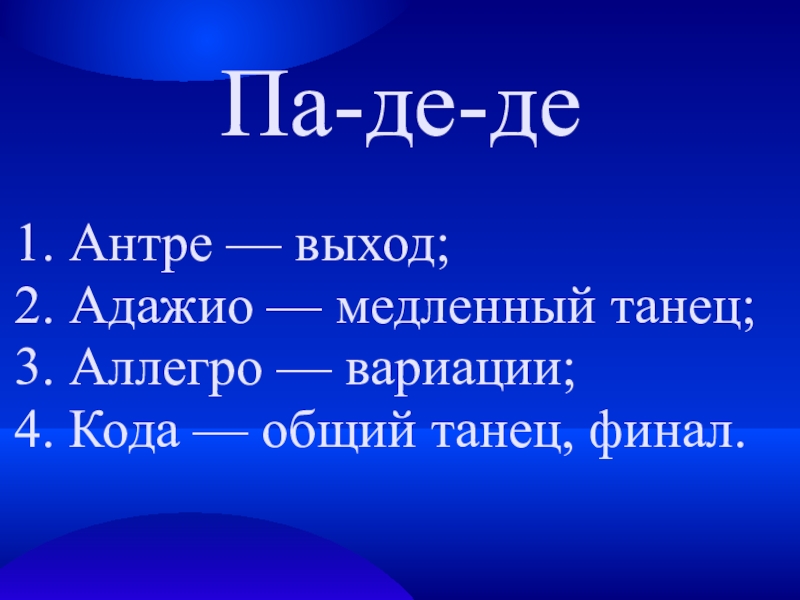 Па-де-де1. Антре — выход;2. Адажио — медленный танец;3. Аллегро — вариации;4. Кода — общий танец, финал.